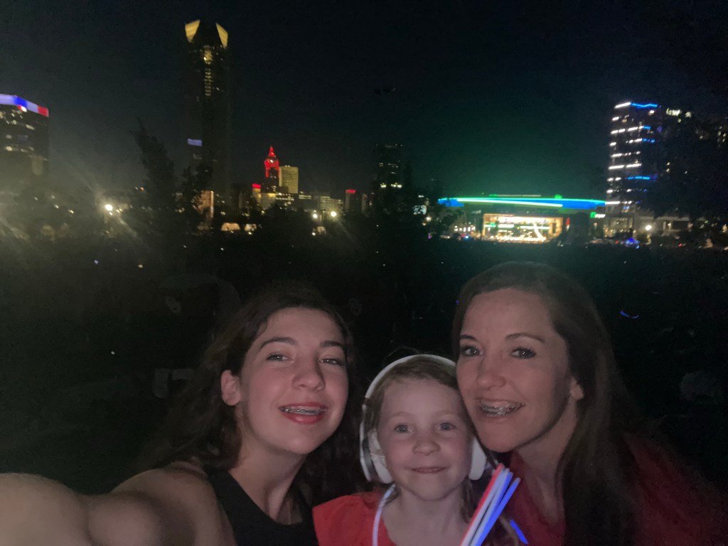 While our view of the skyline and concert was perfect, our view of the fireworks show was perfectly obstructed, by one of the solitary trees sprinkled across the hillside. But it didn’t matter, the younger two just moved their lightsaber fight to a different patch of grass with a better view and we watched as the lights reflected in realtime off of the downtown buildings.